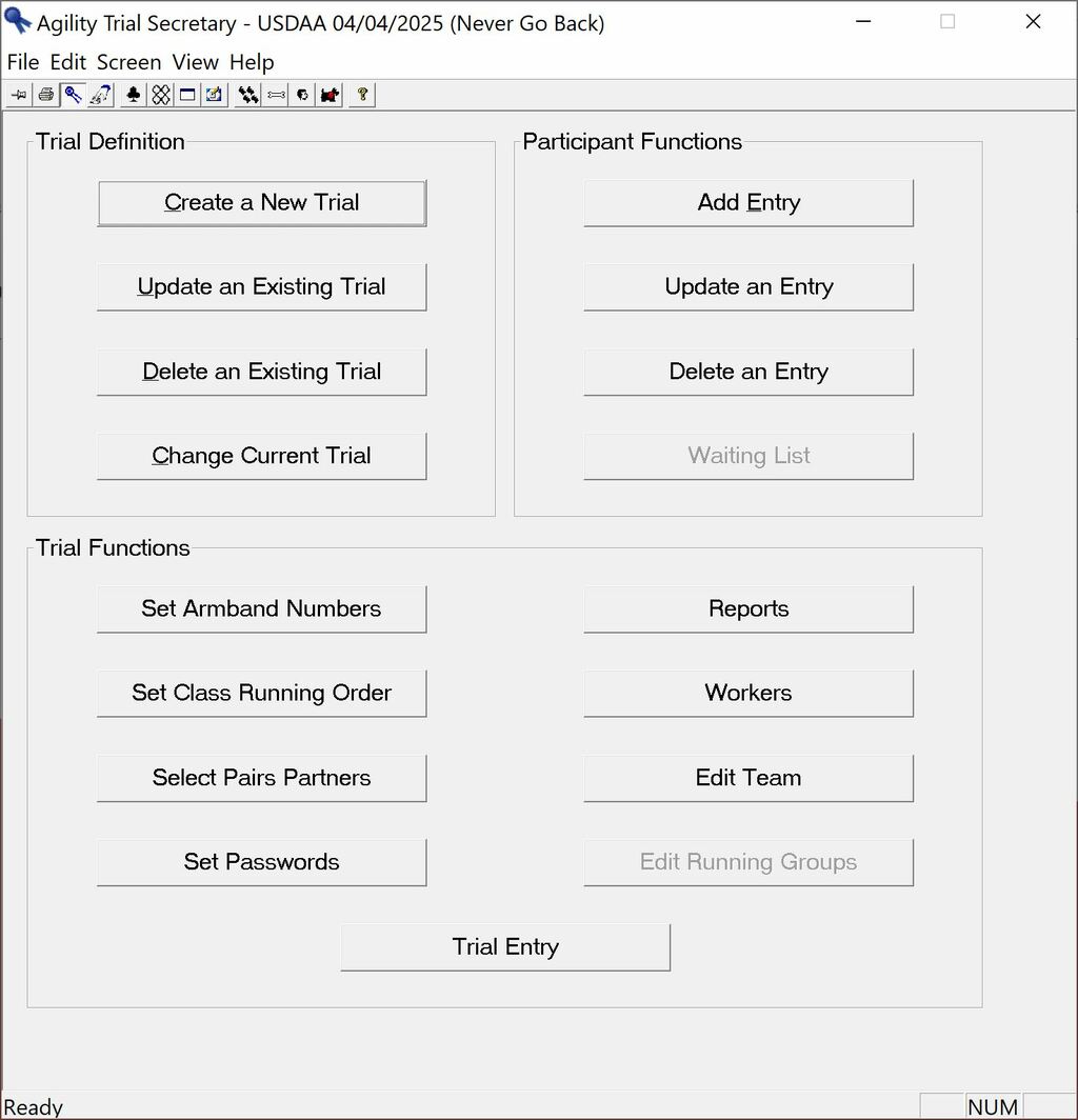 This is the main screen for the Agility Trial Secretary software (AGTSec).